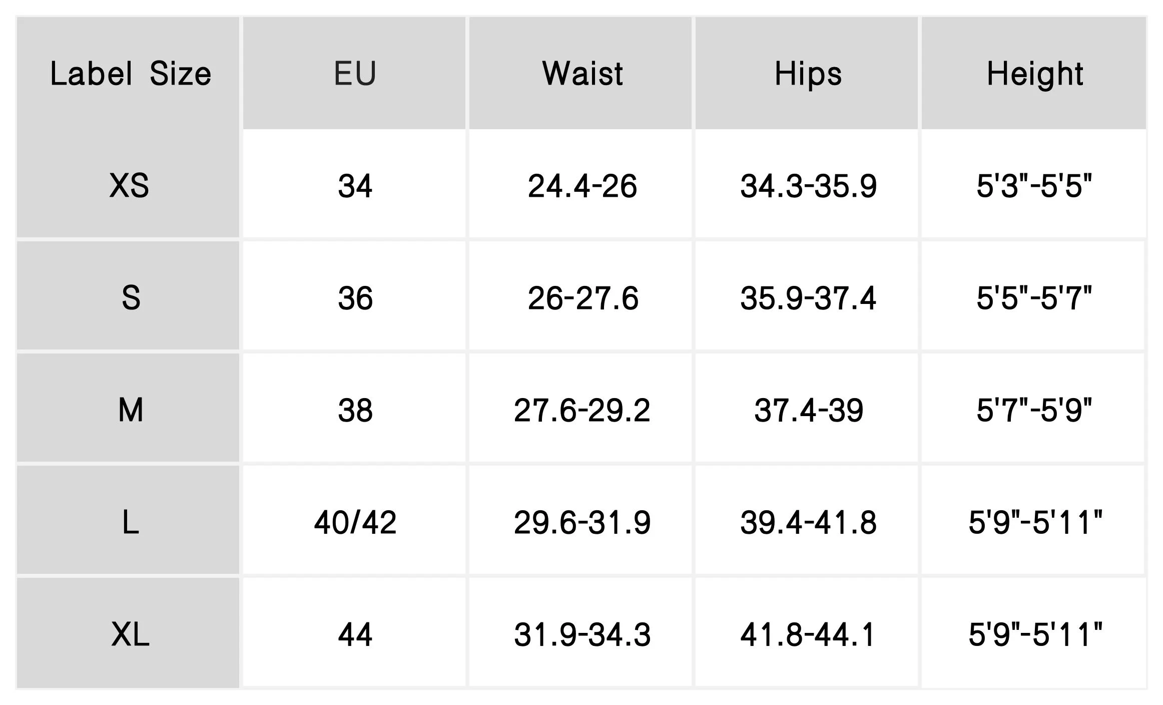 XS, S, M, L, XL
